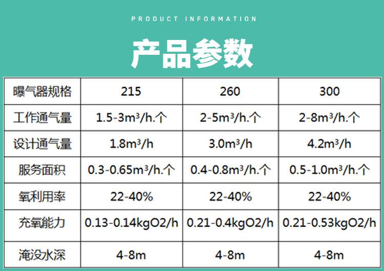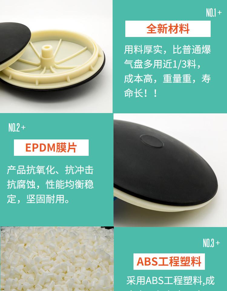 (1)橡膠膜片:選用進口優質橡膠原料,根據曝氣工況需求量身定制材質成分與配比,具有良好的物理、化學性能,有效防止膜片收縮、硬化與老化,延長產品壽命。